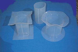 ■ 丸・テーパー筒状溶着と角・丸フランジ立体溶着品です。 ふるい機、振動機等の揺動部分の繋ぎダクトとして、 通常の布ダクトには無い柔軟性と長寿命を実現し、しかも半透明の為、流体物の確認作業も容易になりました。 |
